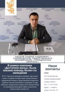 По его словам, в 2017 году была проведена компания «Доступное жилье», в рамках которой также осуществлялась юридическая помощь и представление интересов в судебных органах проблемных заемщиков. В ходе компании юридическая помощь была оказана более ста заемщикам имеющими займы в различных банках второго уровня РК. Среди данных заемщиков были люди не только из Алматы, но также и из других регионов Республики Казахстан, а именно из Шымкента, Усть-Каменогорска, Караганды, Астаны, города Капшагай. Проблема у всех одна – невозможность обслуживать свои займы, страх потери единственного жилья. Часть вопросов удалось разрешить на стадии переговоров в Банках, чаще при активном участии Департамента по защите прав потребителей финансовых услуг, часть в судах – путем заключения мирового либо медиативного соглашения. Во всех случаях важна добрая воля обеих сторон, желание найти взаимоприемлемое решение.
